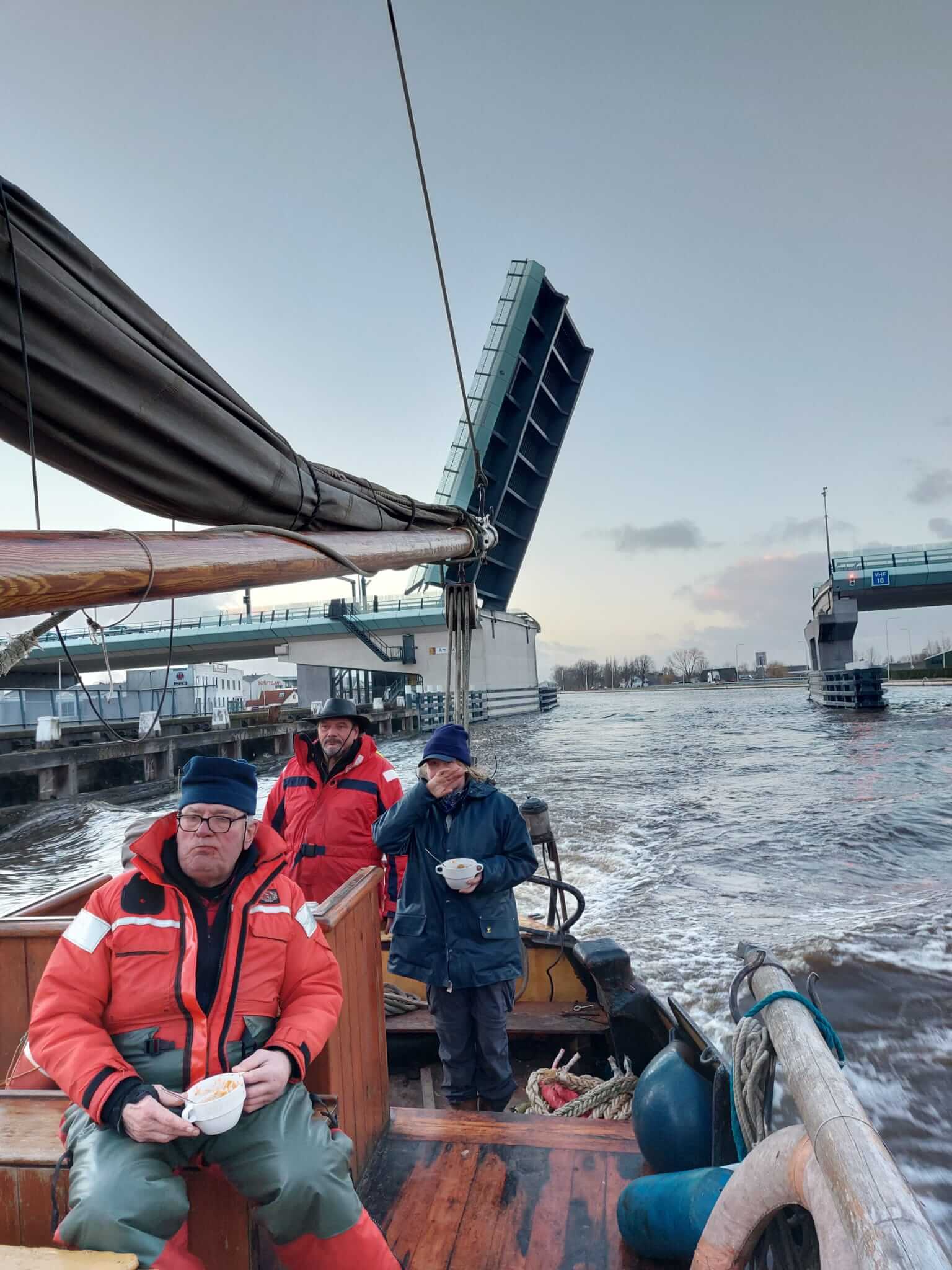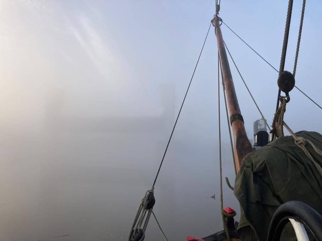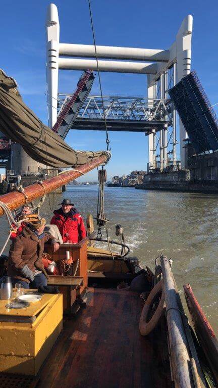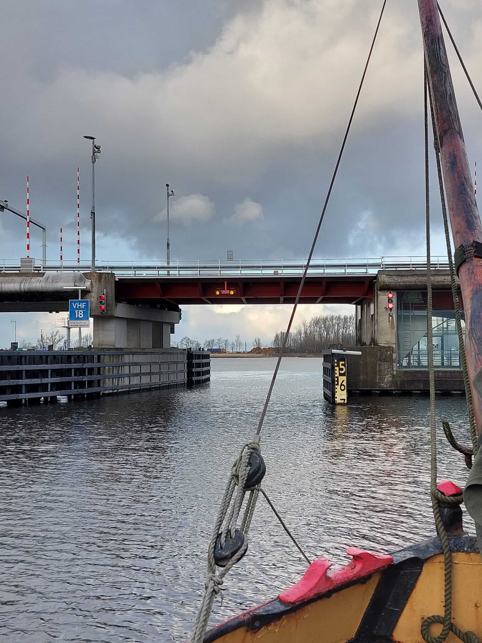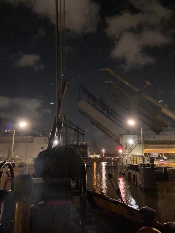 In de morgen was het weerbeeld volledig verandert. De omgeving potdicht door mist met ijzel aan dek. Door hulp van de brugwachter, die ons loodst door de opening van de brug, word toestemming gegeven om aan de steiger van Rijkswaterstaat af te meren en te wachten op zicht. Toen de mist opklaarde is inmiddels contact gezocht met de verkeerspost Dordrecht, waar een vriendelijke medewerker van Rijkswaterstaat een aaneensluitende opening van de bruggen van Alblasserdam, Dordrecht Spoor en de verkeersbrug regelt. Met de tijde vol mee door het Spui “dead slow”, richting Middelharnis om niet te vroeg aan te komen.