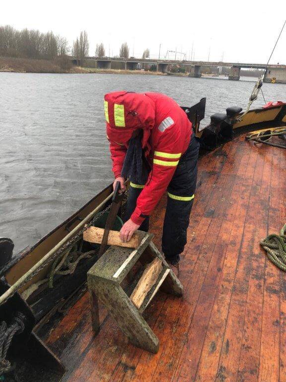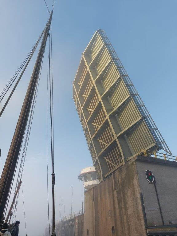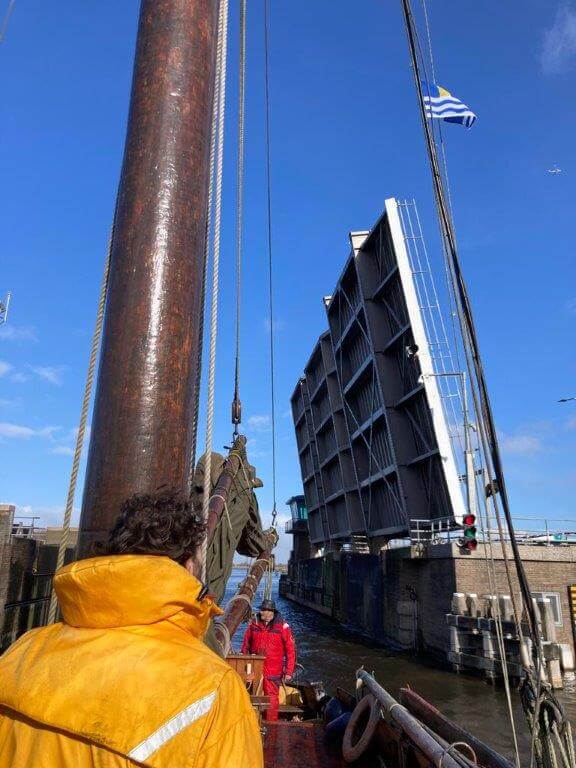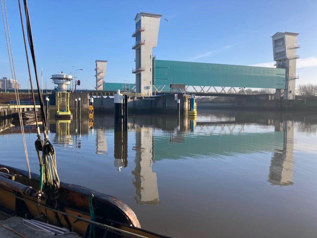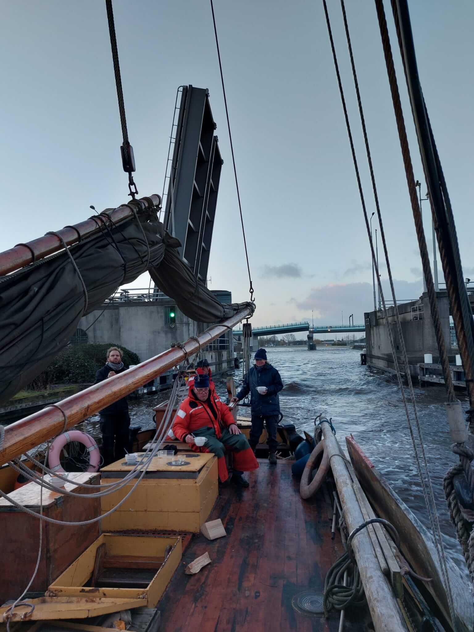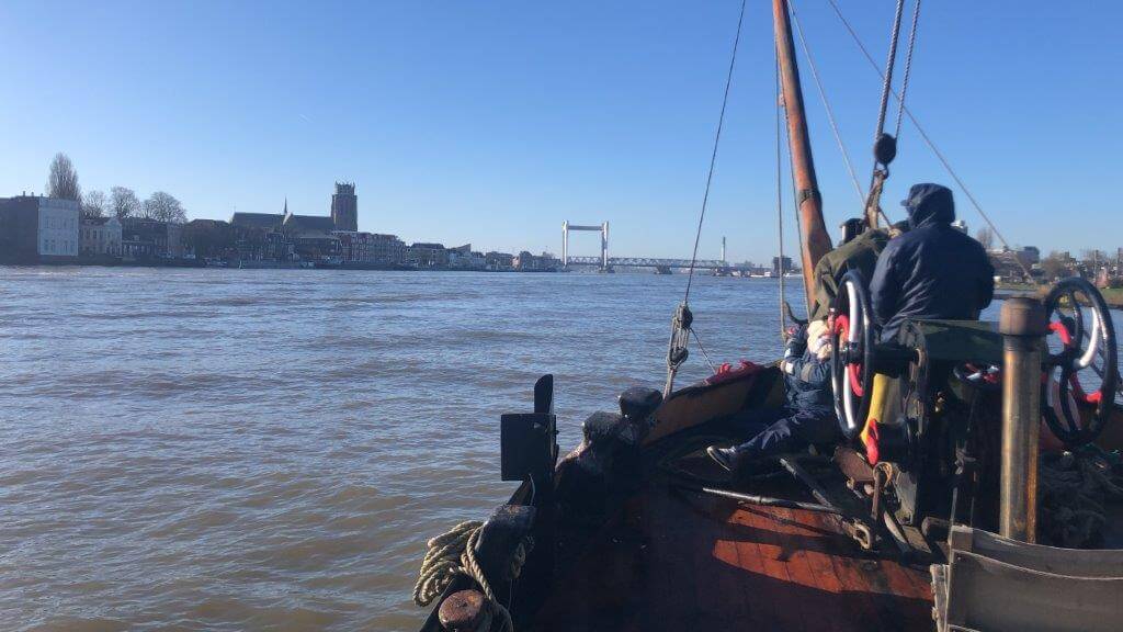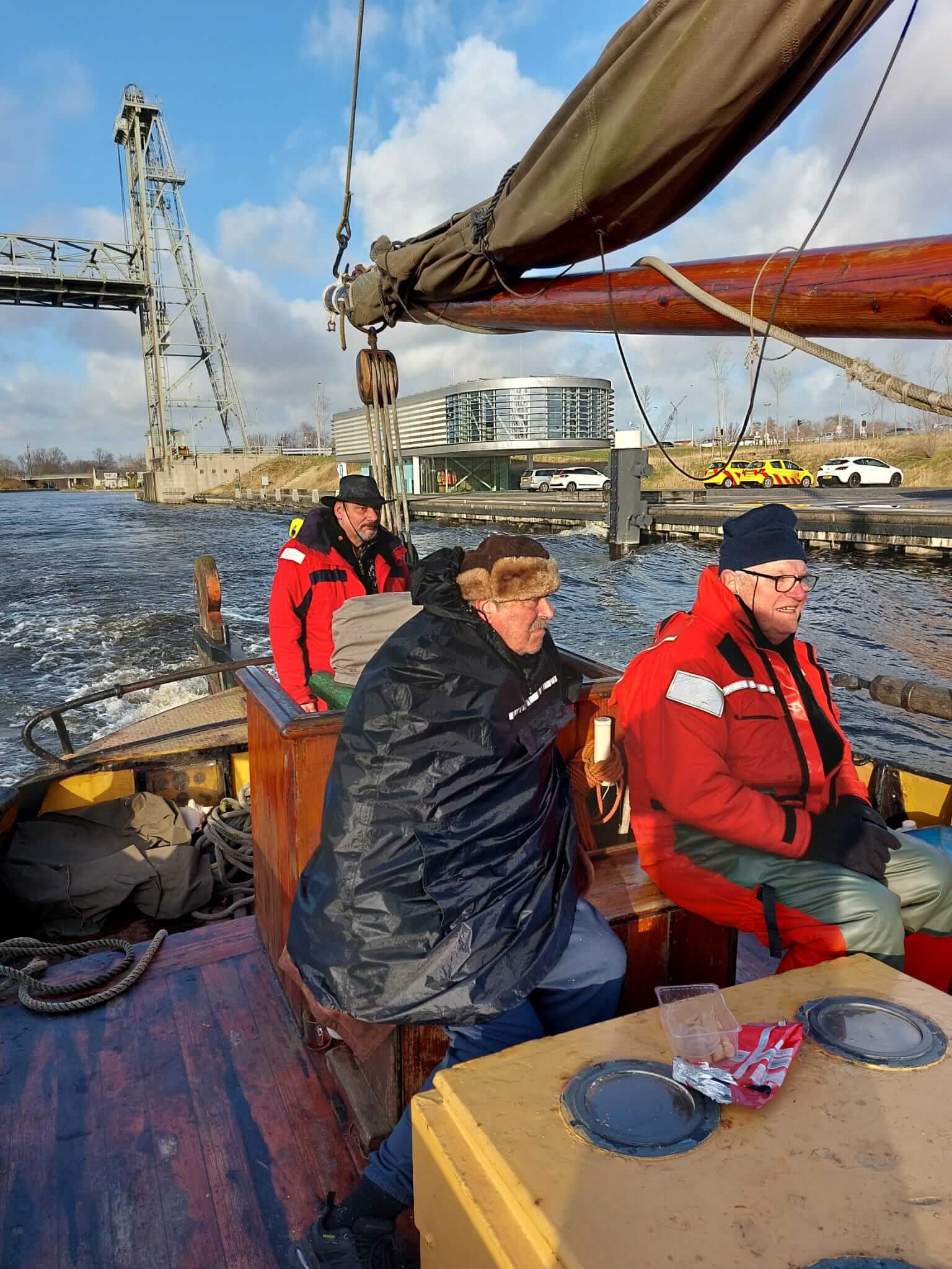 In de morgen was het weerbeeld volledig verandert. De omgeving potdicht door mist met ijzel aan dek. Door hulp van de brugwachter, die ons loodst door de opening van de brug, word toestemming gegeven om aan de steiger van Rijkswaterstaat af te meren en te wachten op zicht. Toen de mist opklaarde is inmiddels contact gezocht met de verkeerspost Dordrecht, waar een vriendelijke medewerker van Rijkswaterstaat een aaneensluitende opening van de bruggen van Alblasserdam, Dordrecht Spoor en de verkeersbrug regelt. Met de tijde vol mee door het Spui “dead slow”, richting Middelharnis om niet te vroeg aan te komen.