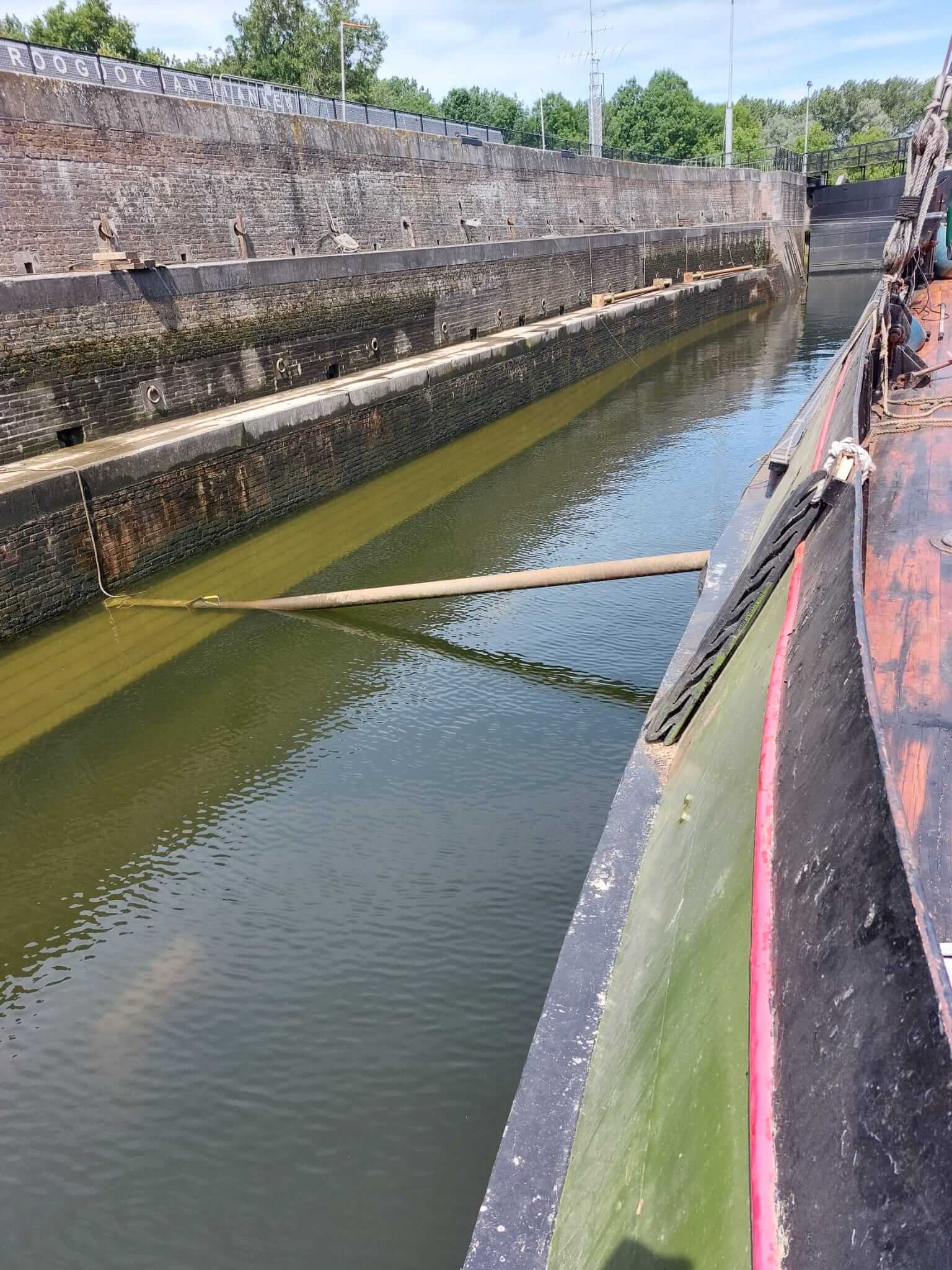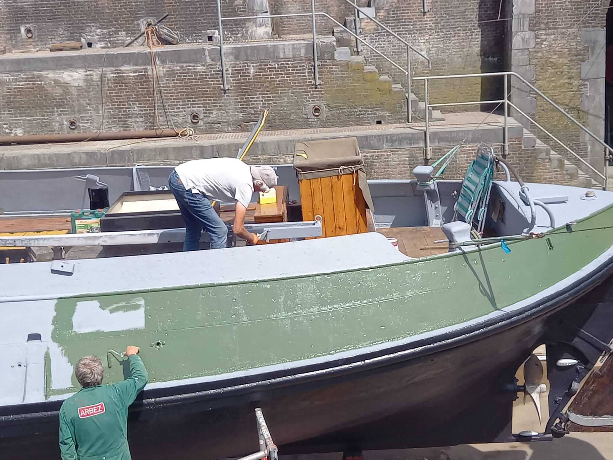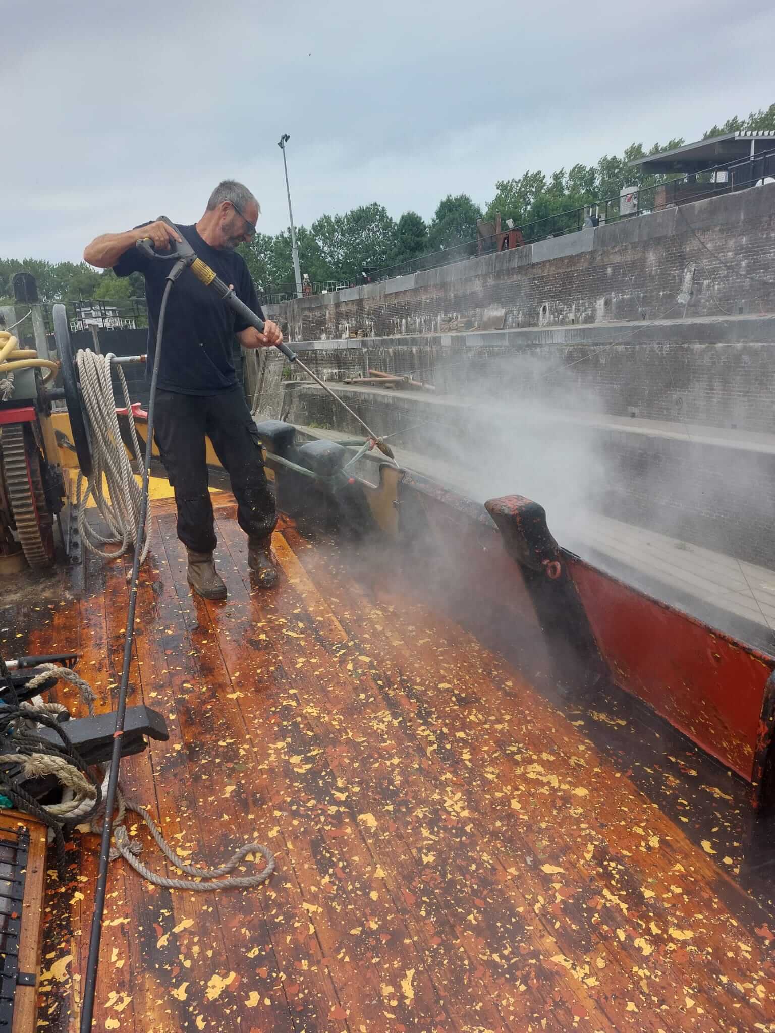 rond 10.30 uur zijn we ‘t Dok ingevaren. Na het afspannen is de MD3 stevig gesteld, wat geen risico meer op omvallen geeft. Nu kan t leegpompen beginnen. Eenmaal gesteld kan het afspuiten beginnen. Onze kanjer Jan Geelhoed heeft deze taak meer dan goed uitgevoerd. Het onderwaterschip is schoon en de verflaag kwam relatief makkelijk los.