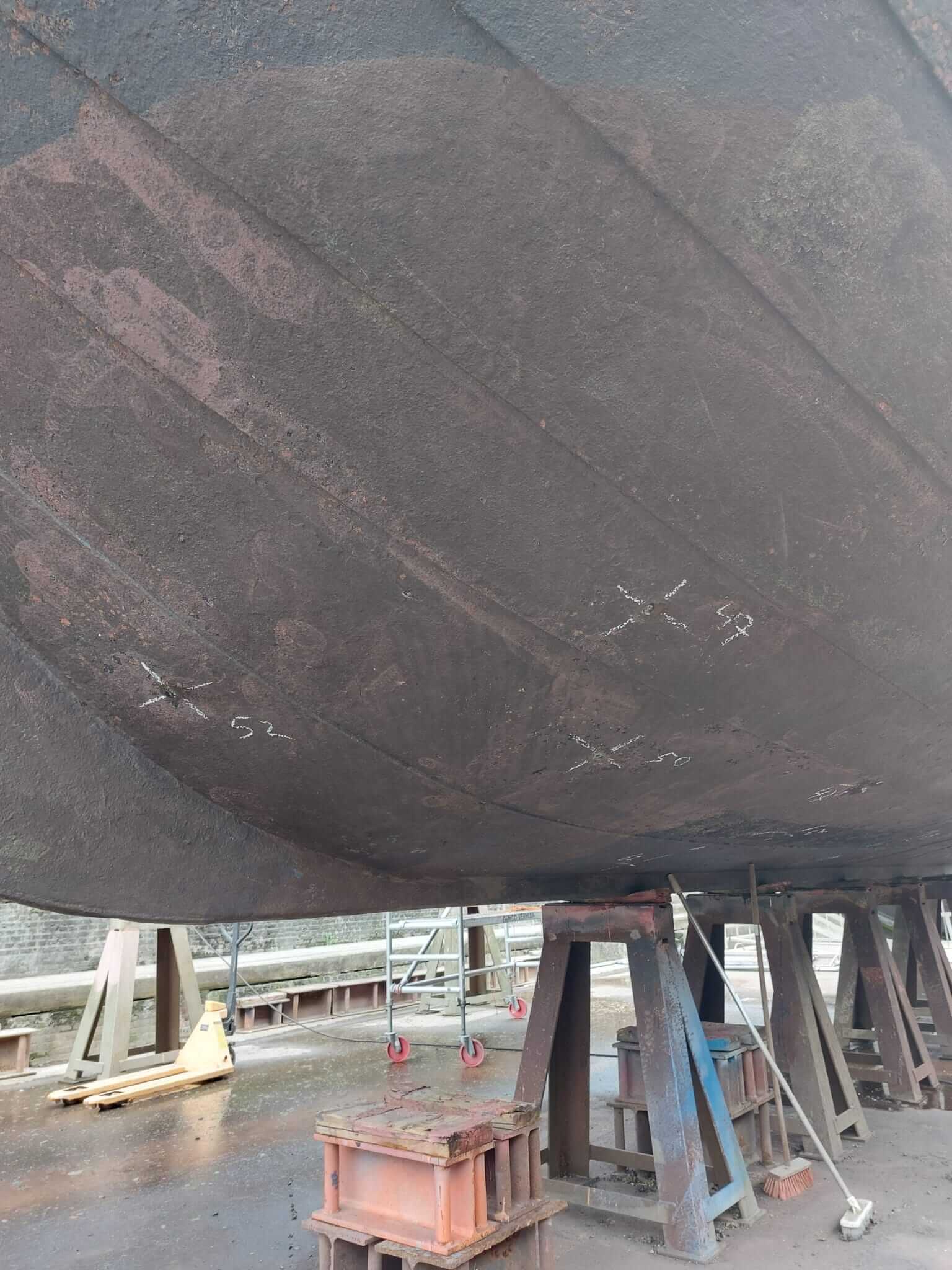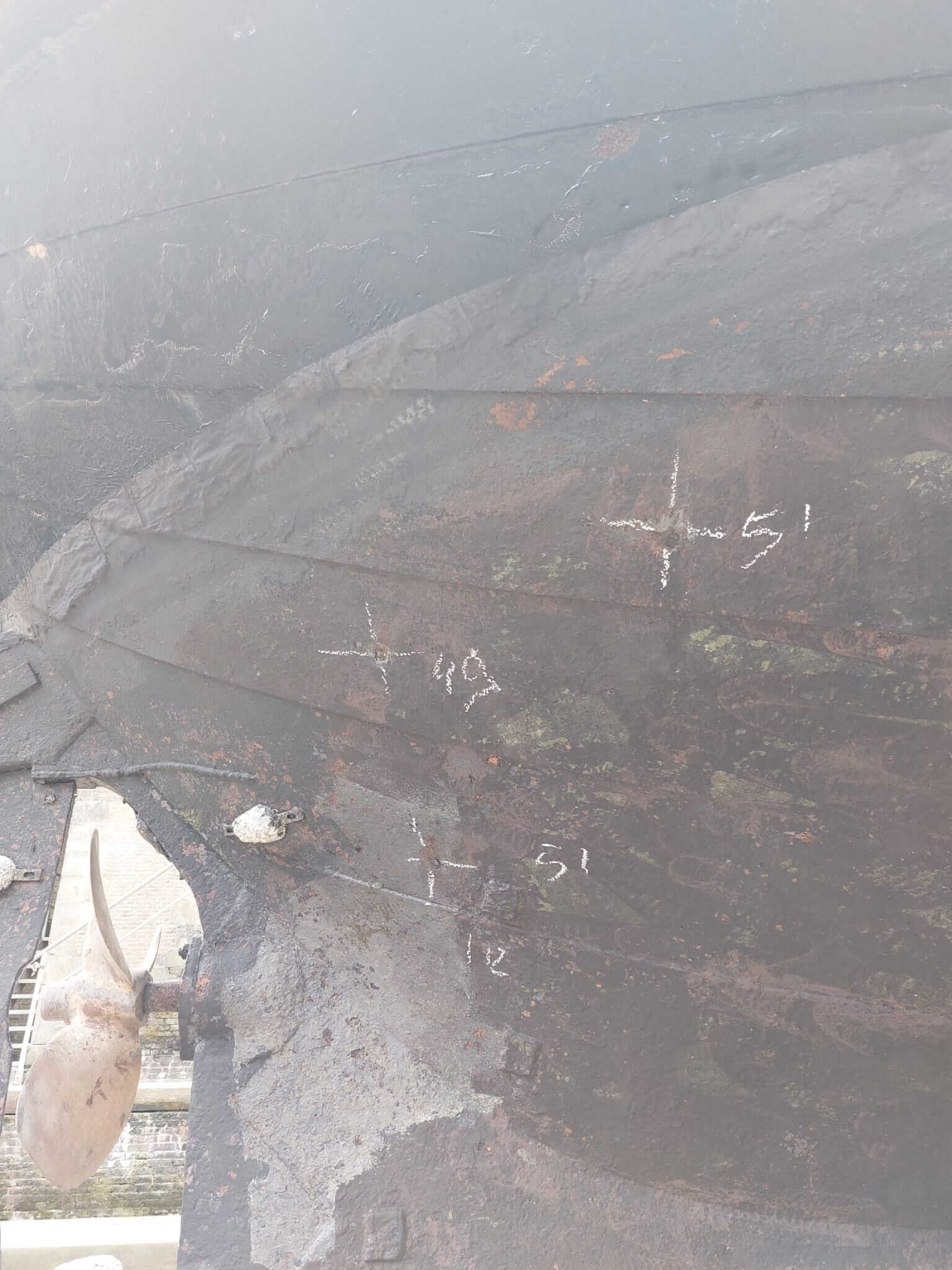 De keuring heeft vandaag plaatsgevonden en valt mee. Na huiddiktemetingen moeten er 2 platen worden aangebracht en enkele strippen. Morgen staat een lasser/ijzerwerker ingepland het werk op te nemen en uit te voeren. De verflaag komt goed los, de ijzermenie /grondlaag blijft stevig vast.