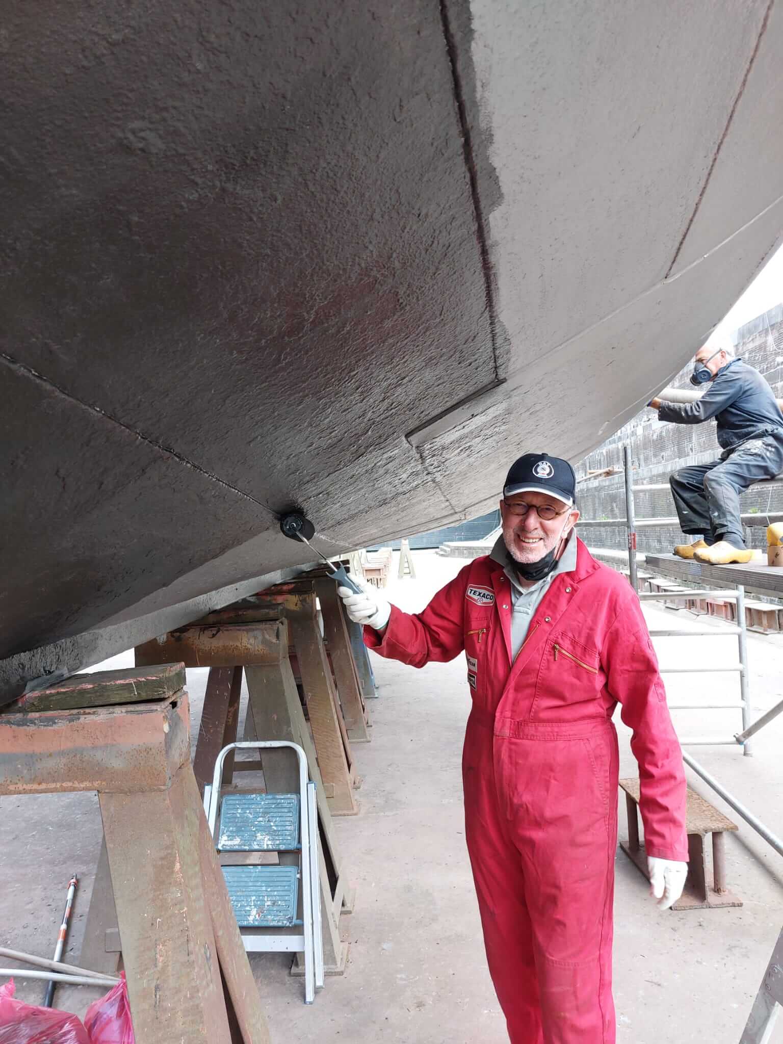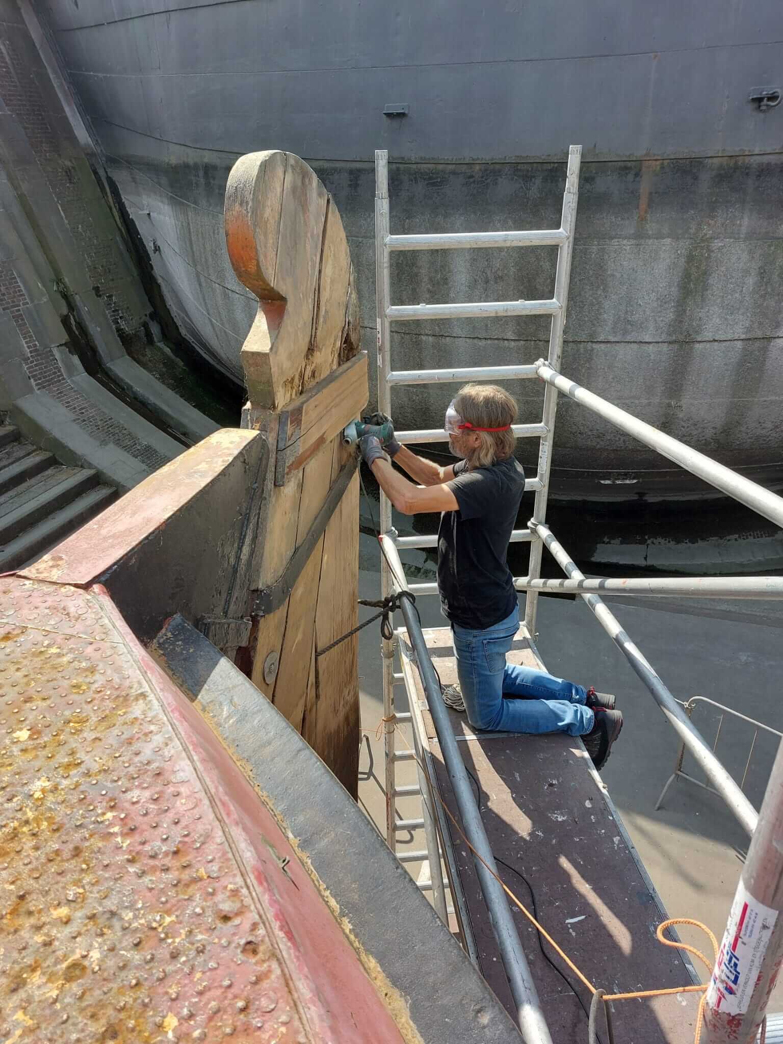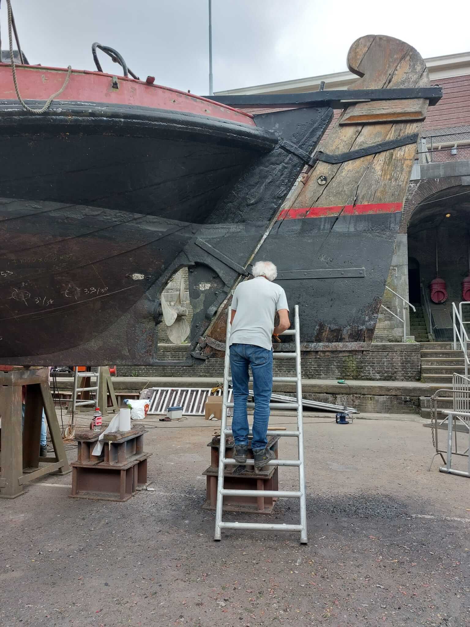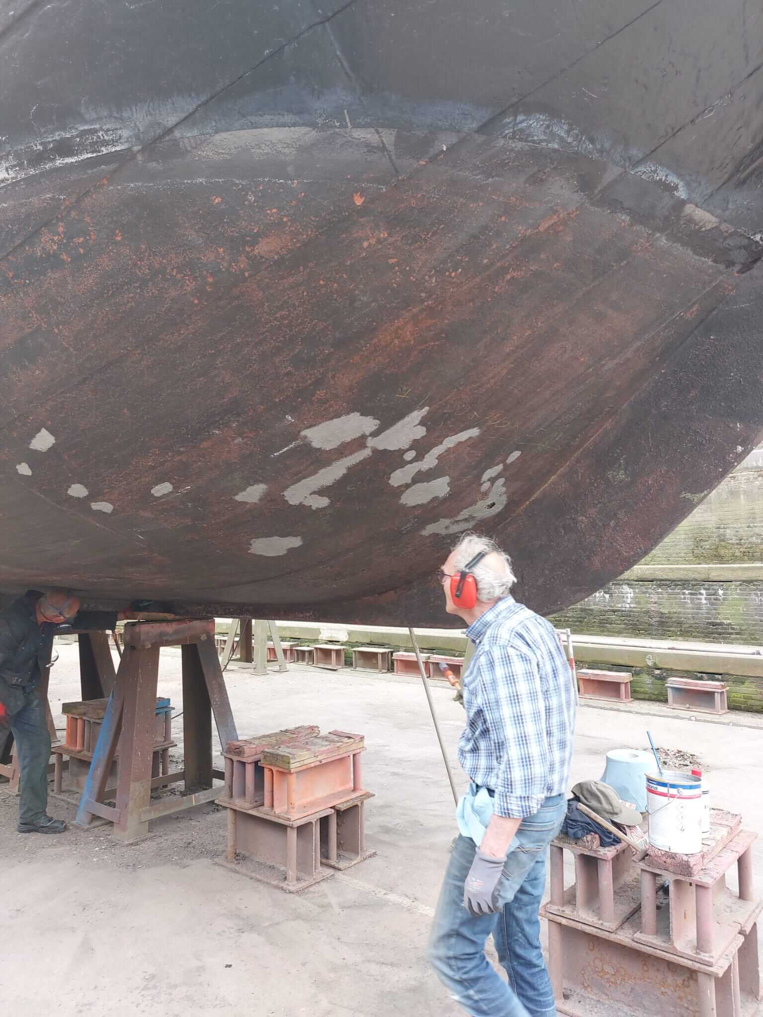 Bert is vandaag van de houtbewerking. De rest is actief met lassen schrappen schuren en schilderen. De bussen zijn al leeg. Het junioren team is perfect voor het onderwaterschip. Wout en Arie bedankt Het droogdok gebouw heeft een trouwerij. We hebben veel bekijks. Morgen verder met the old lady