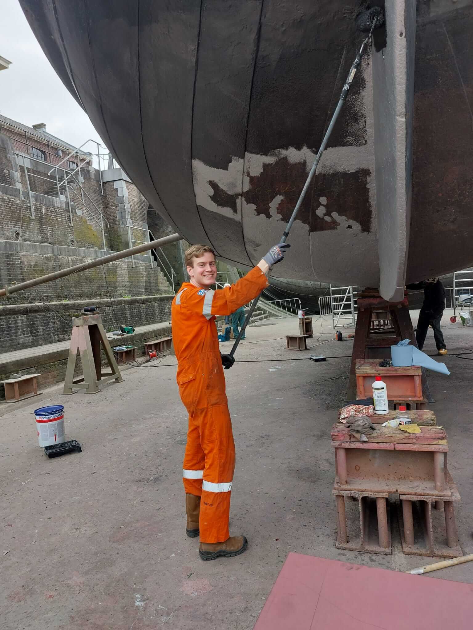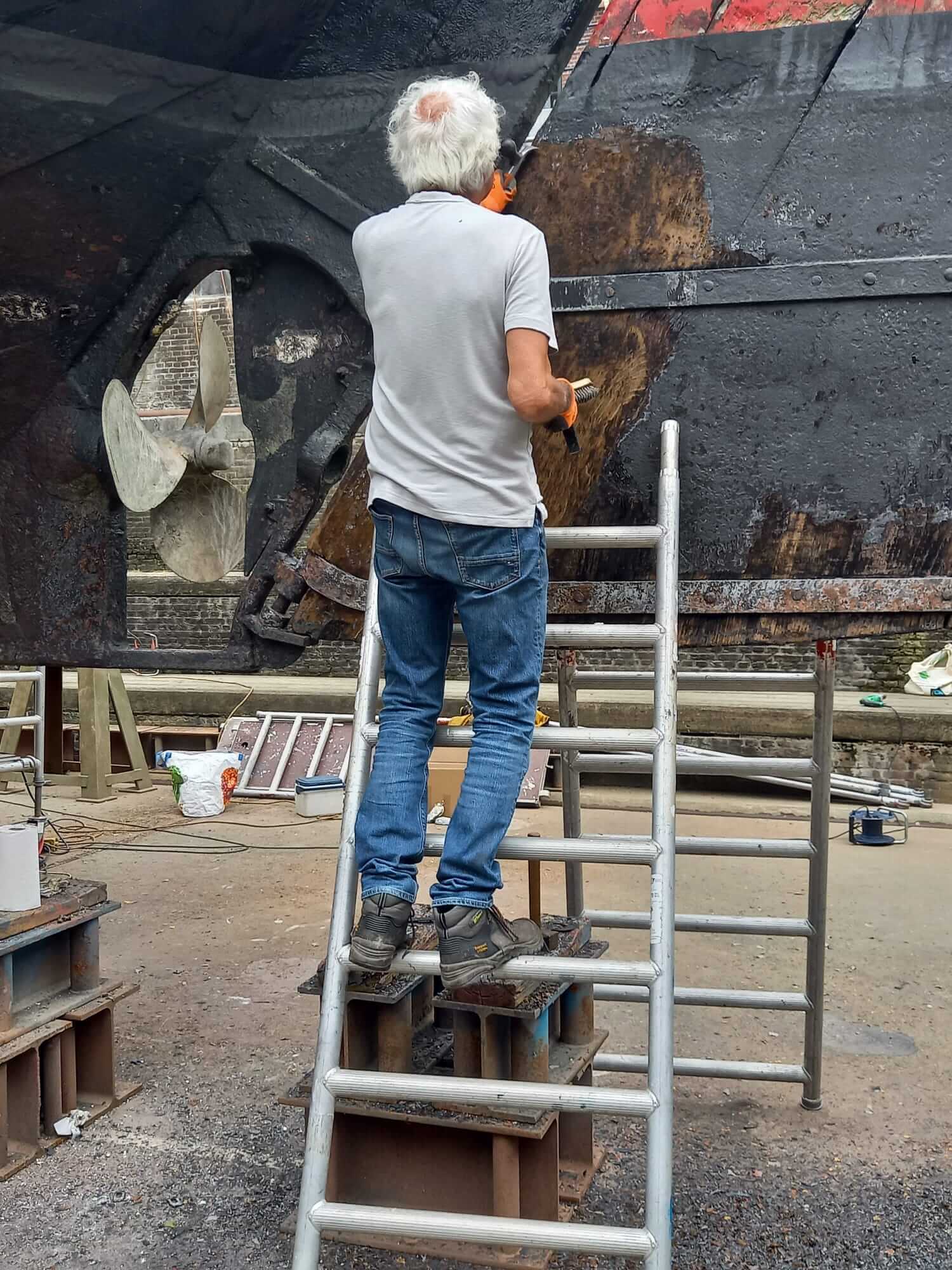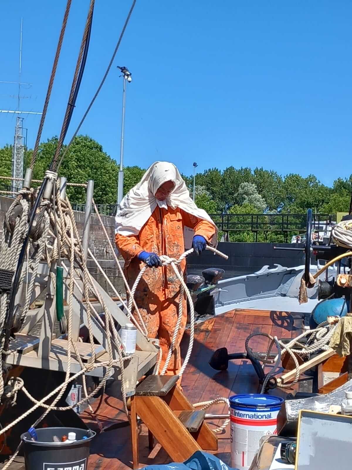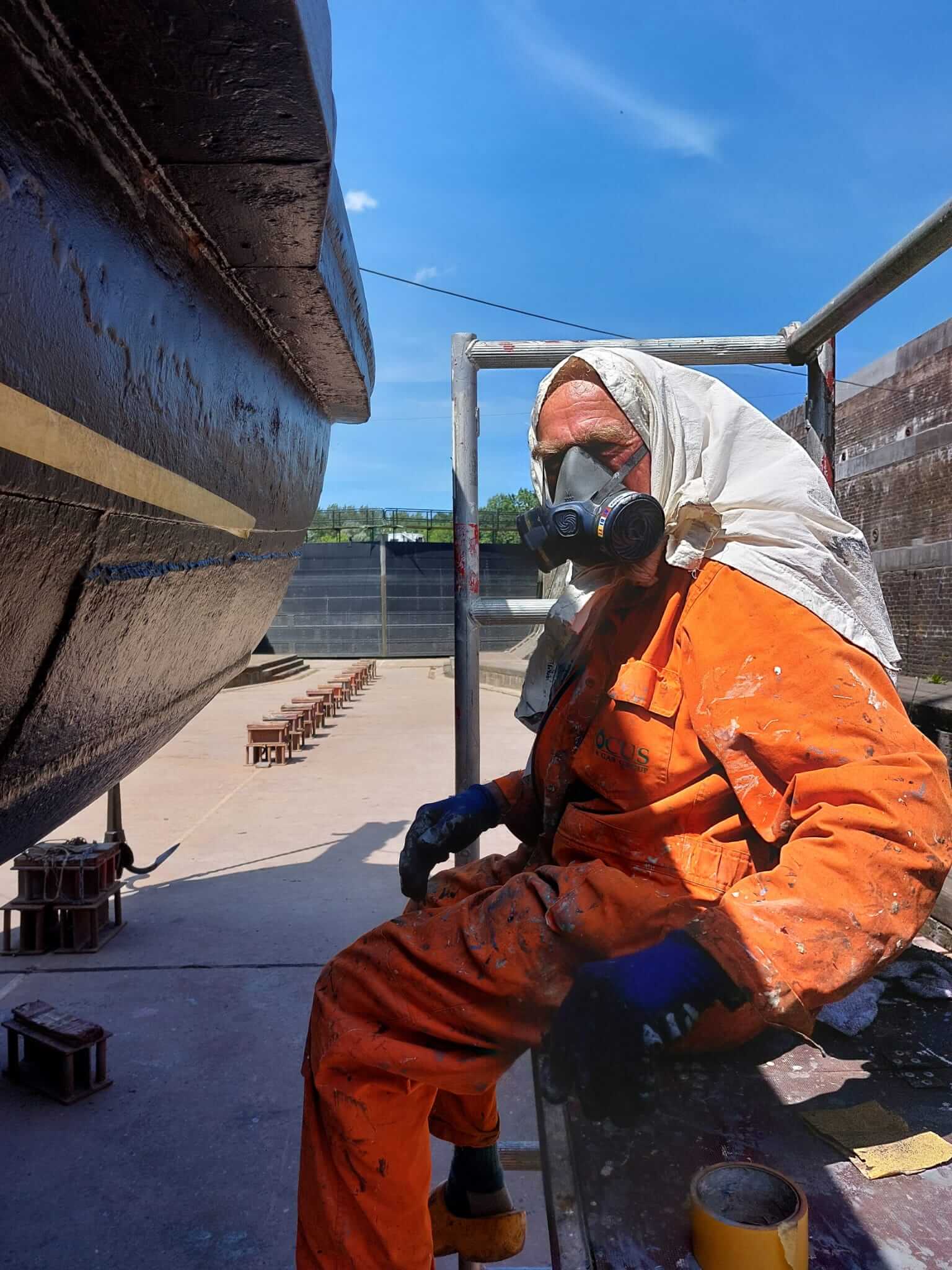 Bert is vandaag van de houtbewerking. De rest is actief met lassen schrappen schuren en schilderen. De bussen zijn al leeg. Het junioren team is perfect voor het onderwaterschip. Wout en Arie bedankt Het droogdok gebouw heeft een trouwerij. We hebben veel bekijks. Morgen verder met the old lady